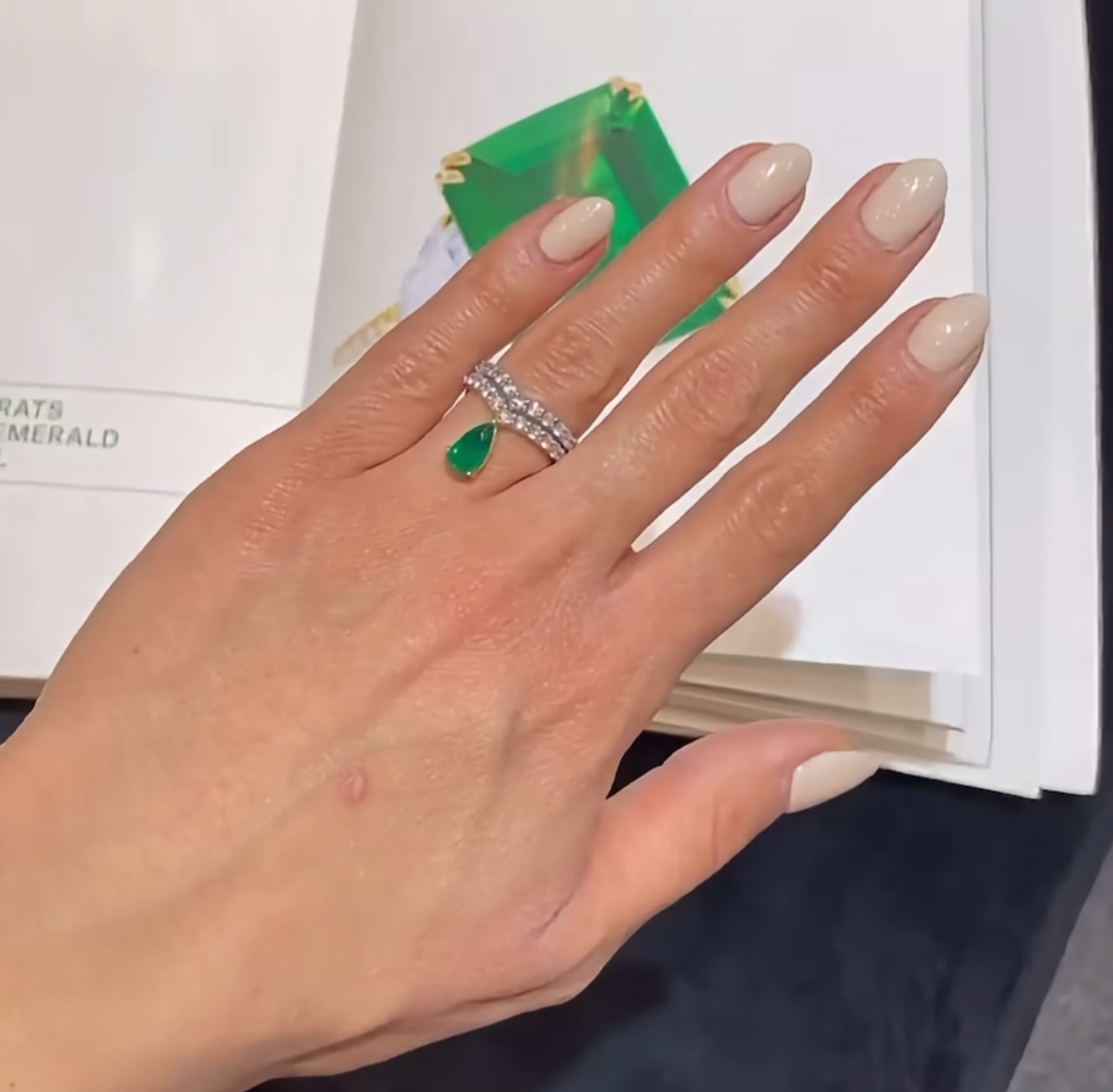Handcrafted white gold ring with a precision-cut pear-shaped emerald and pavé diamond band.